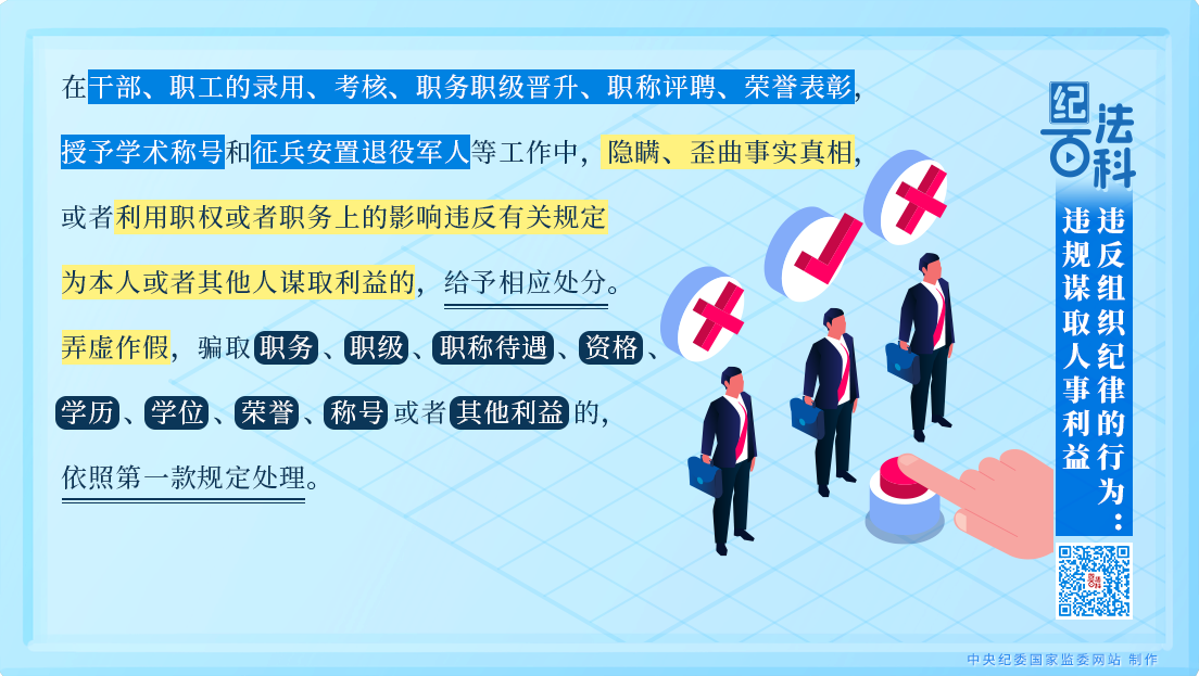 第一款規(guī)定,在干部、職工的錄用、考核、職務職級晉升、職稱評聘、榮譽表彰,授予學術稱號和征兵安置退役軍人等工作中,隱瞞、歪曲事實真相,或者利用職權(quán)或者職務上的影響違反有關規(guī)定為本人或者其他人謀取利益的,給予相應處分。