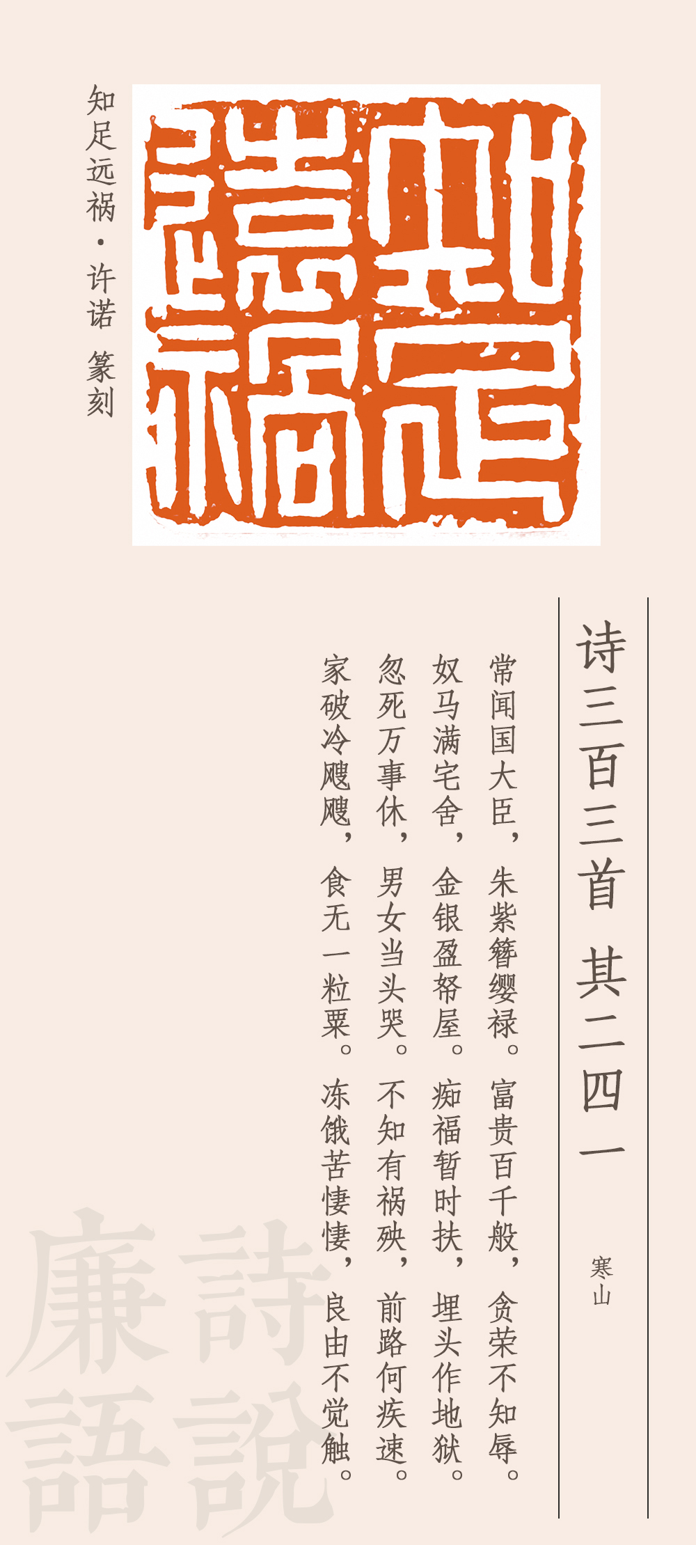這首詩是諷刺高官貪圖富貴、聚斂財物的。他說,有些國之大臣,穿戴尊榮,好不威風,享受千般榮華富貴,卻一點兒都不顧及廉恥榮辱,家中擁有大量駿馬奴仆,屋子里堆滿金銀財寶,自以為這是在享福,其實是在給自己挖墳墓地獄。一旦死去,萬事皆休,富貴是無法永久保留的。如果因貪腐而遭受禍殃,那下場就會很慘。家破人亡,挨凍受餓,凄風苦雨,苦不堪言。最后一句卒章顯志:之所以會有這樣的遭遇和結(jié)局,是因為沒有悟透取禍的原因。這個原因從前面所述來看,就是太貪婪、不知足。
