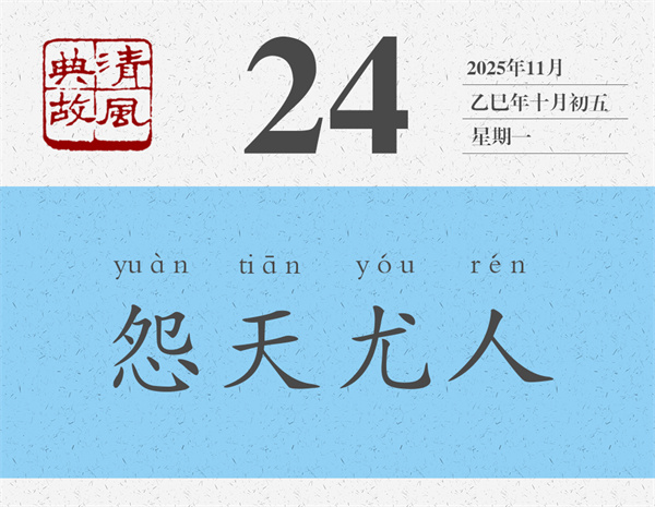 朱熹《論語集注》對“不怨天,不尤人”的理解要簡潔得多,也深刻得多:“不得于天而不怨天,不合于人而不尤人。”《荀子·榮辱》則更進一層:“自知者不怨人,知命者不怨天。”能夠看清自己的人就不會去埋怨別人,那么埋怨誰呢,當然是埋怨自己了;能夠知道自己命運的人就不會怪罪于天,那么怪罪誰呢,當然是怪罪自己了。后世則反“不怨天,不尤人”之意,而以“怨天尤人”為典,形容遇到不稱心的事情,或者事情不順利的時候,一味埋怨天,一味責(zé)怪別人。言外之意,就是不從主觀上找原因,不在自己身上找問題。宋人李昌齡《太上感應(yīng)篇》:“苛虐其下,恐嚇于他。怨天尤人,呵風(fēng)罵雨。”