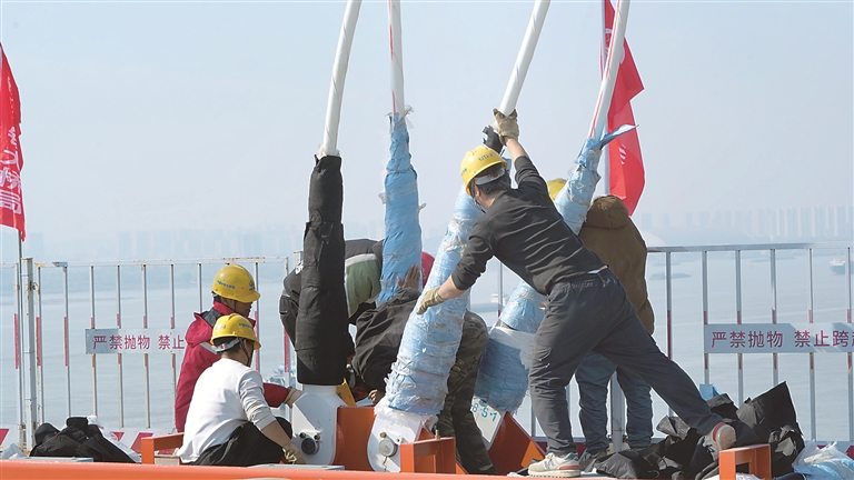 鋼桁梁吊裝到位后,施工人員連接吊索。施瑞 攝