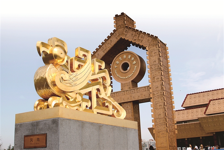 中國(guó)文字博物館前廣場(chǎng)。前方為鳳鳥雕塑,取形于青銅器鳳鳥紋。后方為字坊,取金文中“字”之形。中國(guó)文字博物館供圖