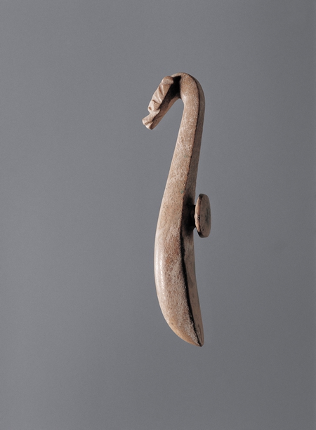 漢代,武威市雷臺(tái)漢墓出土。長10厘米,寬1.5厘米,厚2.7厘米。青玉,淺浮雕。鉤首雕成龍頭形,高而窄,鉤肚圓鼓,背有一圓鈕。帶鉤是古代服飾配件,兼有實(shí)用和裝飾的雙重作用,材質(zhì)多樣,工藝繁簡各異。