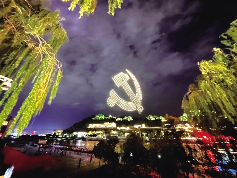 今夜的蘭州經(jīng)過雨水的沖洗格外清爽嫵媚,在現(xiàn)場,600架無人機翱翔天空,照亮璀璨的蘭州之夜,無人機在遙控下變換著各種隊形和字樣,表達對黨的生日祝福。