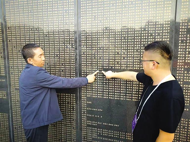 梁德保和梁潤(rùn)全(右)在烈士陵園的英名墻上找到了親人的名字(甘肅省退役軍人事務(wù)廳 章小冬 供圖)