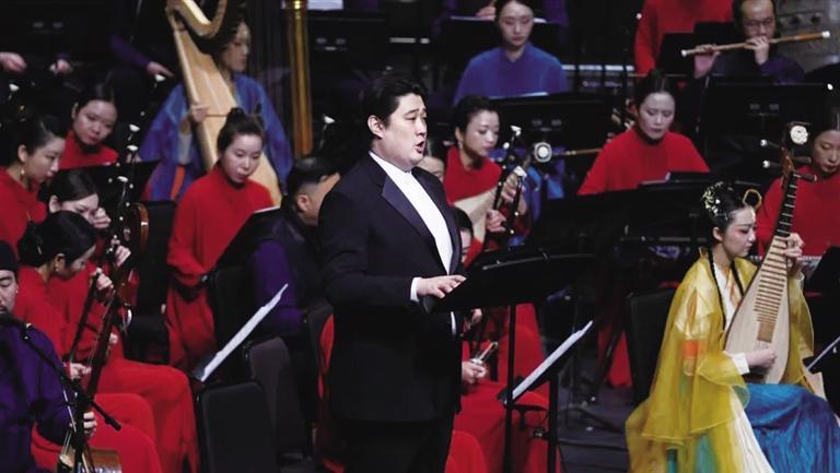 國樂版《敦煌·慈悲頌》,根據(jù)民族樂隊(duì)的特點(diǎn)傾情打磨創(chuàng)作,將壁畫的戲劇情節(jié)用音樂呈現(xiàn),通過壁畫與音樂旋律的結(jié)合,展現(xiàn)偉大的敦煌藝術(shù),彰顯中華傳統(tǒng)文化中向善向上的精神力量。圖為演出現(xiàn)場(chǎng)。