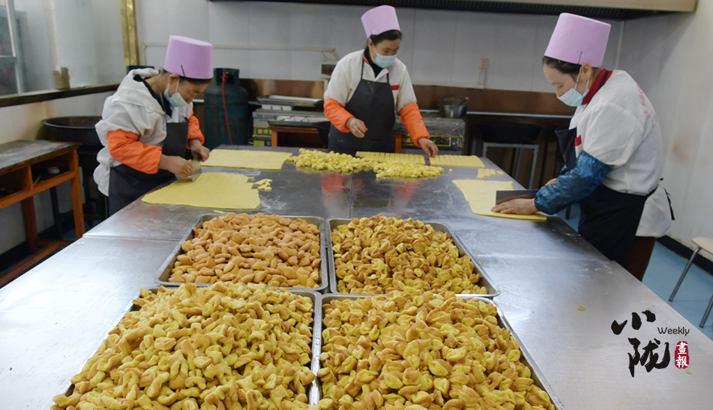 巾幗扶貧車間里婦女們正熱火朝天制作著花馃馃。形狀多樣的花馃馃在鍋里上下翻騰,彌漫著誘人的沁香。