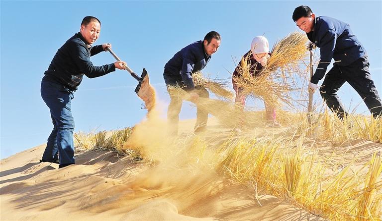 古浪縣八步沙林場工人在騰格里沙漠邊緣打草方格壓沙。甘肅省大力弘揚“時代楷模”八步沙林場“六老漢”的奮斗精神,2012年至2021年,全省累計完成植樹造林4321.21萬畝,沙化土地綜合治理2015萬畝。張文燦攝(中經(jīng)視覺)