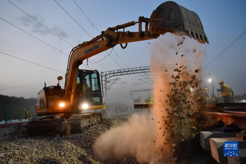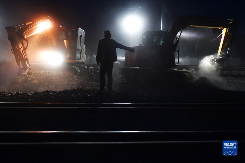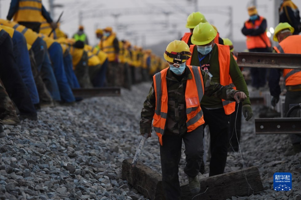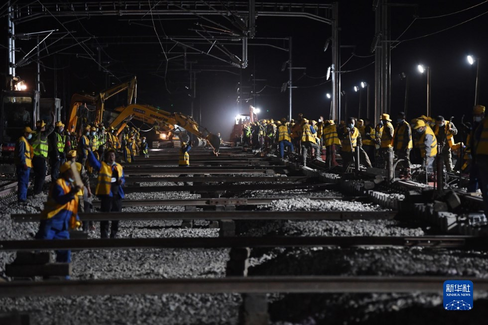 中鐵十一局建設(shè)者在中蘭客專(甘肅段)接入中川城際鐵路道岔插鋪施工現(xiàn)場(chǎng)作業(yè)(4月26日攝)。新華社記者 陳斌 攝