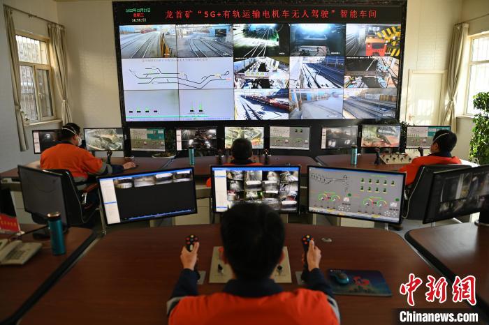 圖為金川集團龍首礦“5G+有軌運輸電機車無人駕駛”智能車間內(nèi),操作員正在進行遠程控制?!?/p>