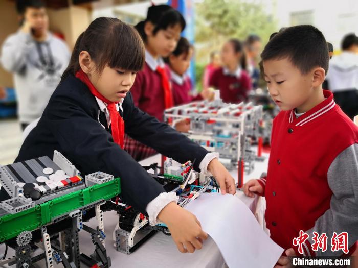 圖為蘭州市城關(guān)區(qū)青少年科技創(chuàng)新大賽上,用樂(lè)高創(chuàng)作的打印機(jī)打印圖畫(huà)吸引學(xué)生觀看。(資料圖)劉薛梅攝