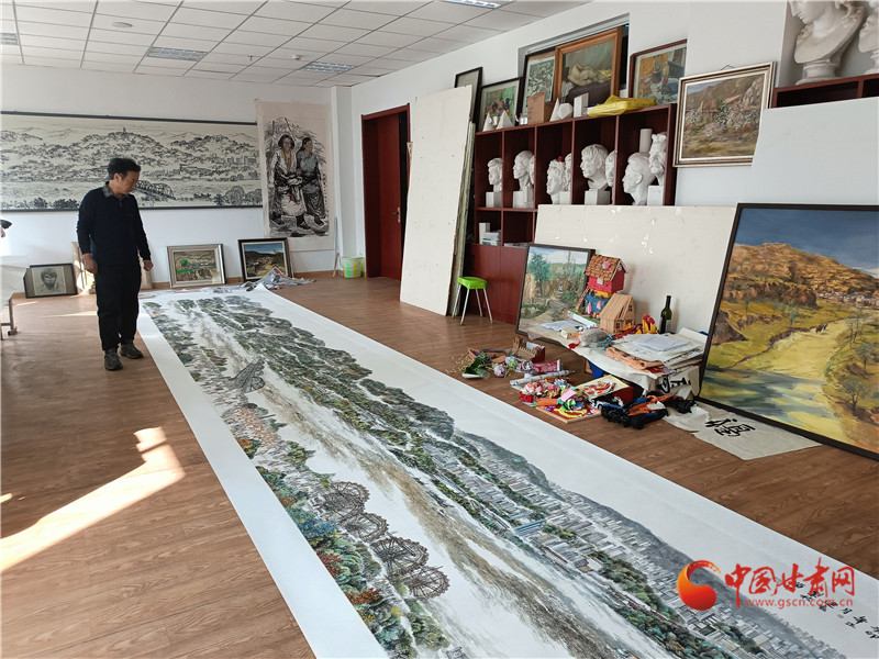 7年前,李建春曾經(jīng)在黑板上素描畫蘭州中山橋、白塔山走紅,在他的筆下蘭州就是一幅畫。這些年,李建春老師靜心創(chuàng)作,希望將蘭州的人文符號通過長卷表達(dá)出來。
