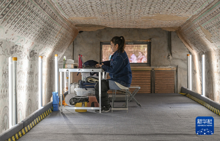 8月3日,在敦煌莫高窟正在保護(hù)修繕的第55窟內(nèi),一位文保工作者對采集的數(shù)據(jù)進(jìn)行整理。新華每日電訊記者 李賀 攝