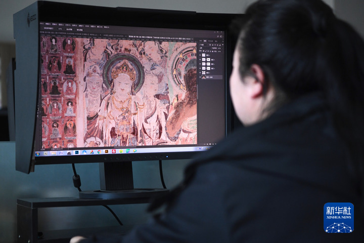 4月25日,敦煌研究院文物數(shù)字化保護(hù)團(tuán)隊圖像處理人員年海麗在拼接壁畫圖像。新華每日電訊記者 陳斌 攝