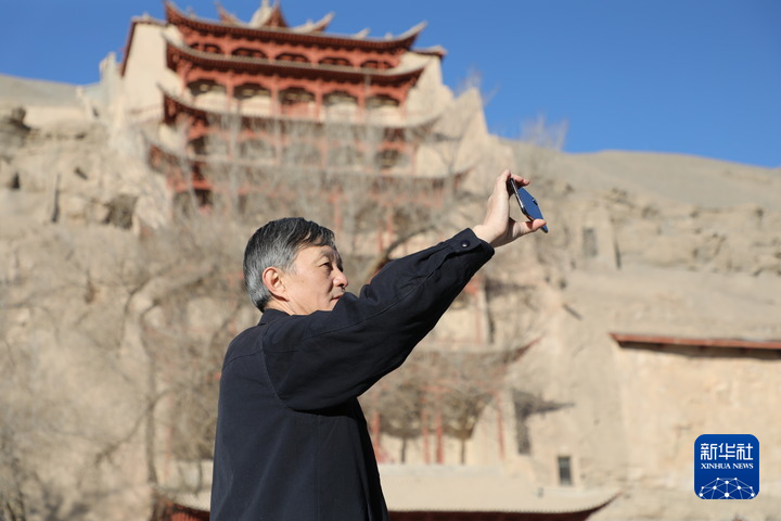 2022年2月23日 敦煌研究院院長蘇伯民正在用手機進(jìn)行“數(shù)字敦煌”體驗。新華每日電訊記者 張睿 攝
