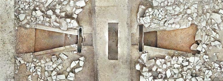 在考古發(fā)現(xiàn)中,我們注意到地磚磚縫采用了高超的填縫技術(shù),形成了密封的地面,地磚鋪設(shè)有一定坡度,使得半地穴內(nèi)地面由四邊到中部形成約0.1米的落差。地面上各處疊壓多件檐頭筒瓦和瓦當(dāng),由此可證明此半地穴空間上方露天,沒(méi)有屋檐,應(yīng)為建筑中心天井。H1北壁有一節(jié)被破壞的陶水管接口,經(jīng)解剖發(fā)現(xiàn)該陶水管向北穿過(guò)夯土高臺(tái),在其北部散水處將半地穴天井中的落水排出。半地穴空間的四壁殘留上下兩排整齊排列的鐵釘,橫向釘在夯土壁上,應(yīng)為固定壁磚之用,殘存壁磚邊緣可見填縫材料,經(jīng)檢測(cè)填縫劑為生石灰混合少量石英砂顆粒的無(wú)機(jī)質(zhì)材料,類似今天的“水泥”。