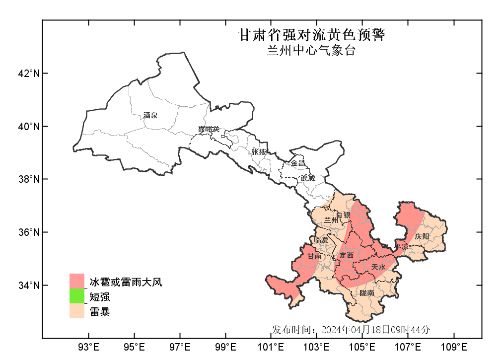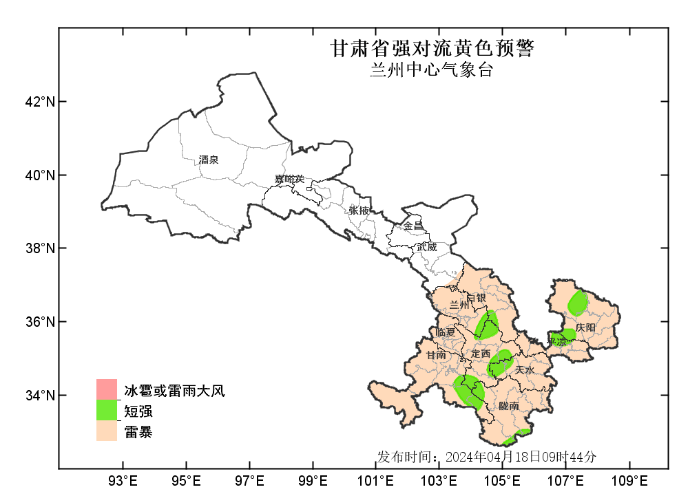 中國甘肅網(wǎng)4月18日訊(西北角·中國甘肅網(wǎng)記者 沈文剛)4月18日9時44分,蘭州中心氣象臺發(fā)布強對流黃色預(yù)警:預(yù)計今天白天到夜間,武威以東大部分地方有雷暴;其中,白銀、定西、甘南、天水等市州部分地方及蘭州、隴南、平?jīng)?、慶陽等市局部地方有雷雨大風或冰雹;甘南、隴南、定西、天水、白銀、蘭州、平?jīng)?、慶陽等州市局部地方有短時強降水,最大小時雨強為20-30毫米。
