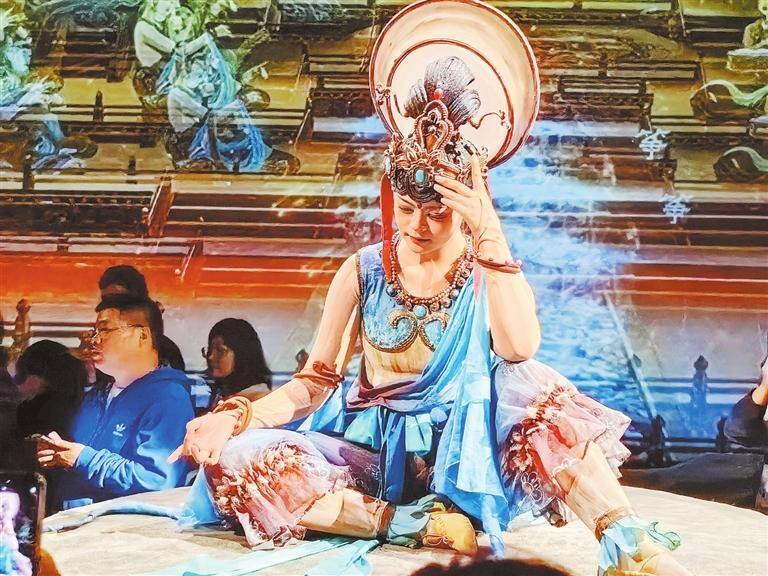 “真是一場酣暢淋漓的敦煌樂舞盛宴。雖然這趟旅程我們還沒有去敦煌莫高窟,但看罷這場演出,已經(jīng)對莫高窟壁畫有了初步的認(rèn)知。莫高窟壁畫的精華部分,借助高科技手段和演員的精彩演繹,在我們眼前立體延展開來,同時劇場內(nèi)大量復(fù)刻了佛龕、蓮花臺、藻井等特色形制,讓我們‘一眼入境’,帶我們走進(jìn)歷史深處,觸摸文明脈動。”浙江游客王松攜家人觀看《樂動敦煌》后,發(fā)出贊嘆。