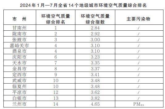 2024年1月—7月,全省14個地級城市環(huán)境空氣質量綜合排名由高到低分別為:甘南州、隴南市、張掖市、嘉峪關市、酒泉市、慶陽市、天水市、金昌市、定西市、武威市、臨夏州、平涼市、白銀市、蘭州市。