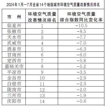 2024年1月—7月,全省14個地級城市環(huán)境空氣質量改善情況排名由好到差分別為:臨夏州、張掖市、天水市、武威市、酒泉市、甘南州、定西市、嘉峪關市、平涼市、金昌市、白銀市、隴南市、蘭州市、慶陽市。