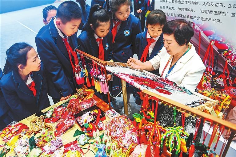 9月22日,慶陽香包刺繡展位非遺傳承人給孩子們展示刺繡技藝。新甘肅·甘肅日?qǐng)?bào)記者丁凱