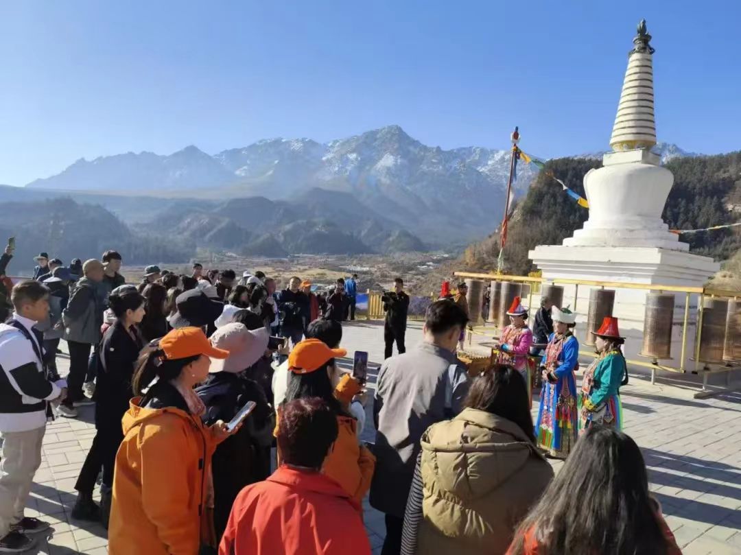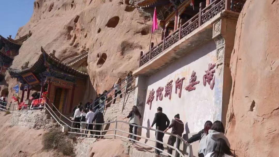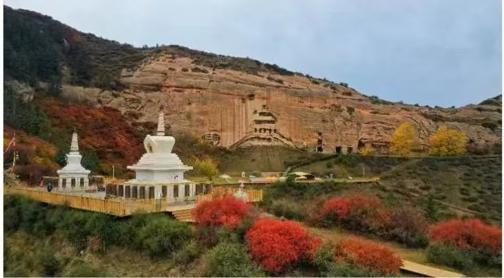 18日上午,迎著耀眼的晨光,采訪團(tuán)成員乘坐大巴車來到了集自然風(fēng)光、石窟藝術(shù)、民族風(fēng)情、宗教文化于一體的肅南馬蹄寺。馬蹄寺是河西走廊著名的佛教勝地,石窟群開鑿于十六國北涼時(shí)期,距今約1600年的歷史,是絲綢之路上至關(guān)重要的歷史文化瑰寶,也是我國早期石窟的杰出代表。秋日的馬蹄寺,秋高氣爽,景色宜人,遠(yuǎn)遠(yuǎn)看去,紅綠相間,層林盡染,大家行走在落葉飄零的山間小路上,對(duì)這座建在懸崖峭壁之上、將棧道鑲嵌在山體之內(nèi)的石窟充滿了好奇。