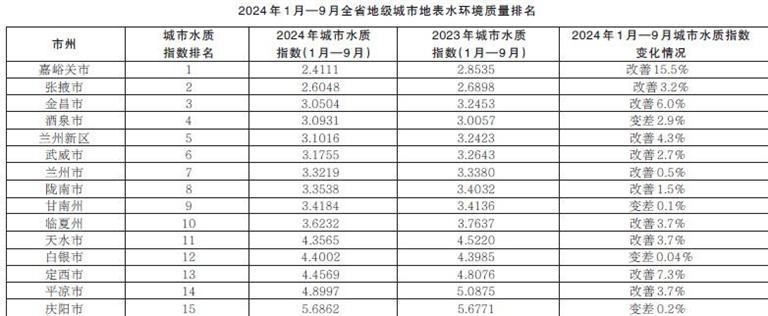 省生態(tài)環(huán)境廳發(fā)布2024年1月—9月全省14個地級城市及蘭州新區(qū)地表水環(huán)境質量排名情況