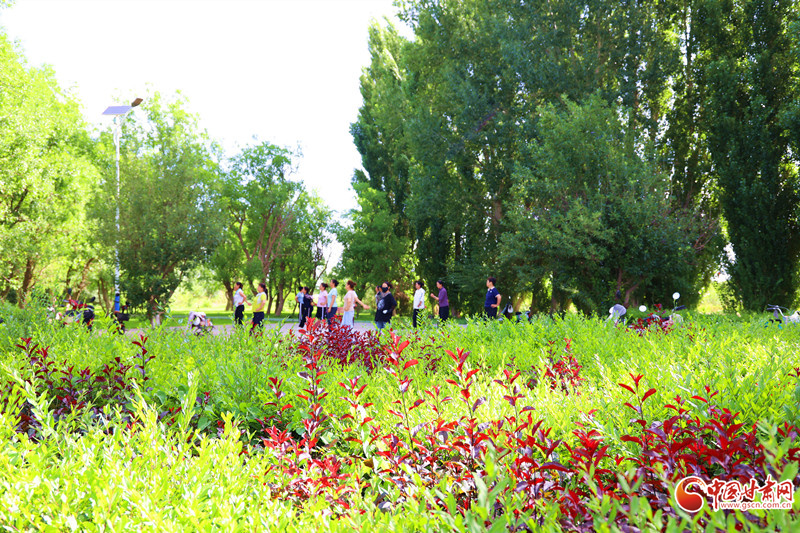 7月8日,雨后的臨澤小城初晴,天空湛藍(lán)。棗鄉(xiāng)風(fēng)情園的睡蓮池畔,成為市民和游客的熱門去處。古亭倒影在平靜的池水中,與盛開的睡蓮相映成趣。市民游客坐在池邊長椅上閑聊,鍛煉的人們也沉浸在這愜意的氛圍中。