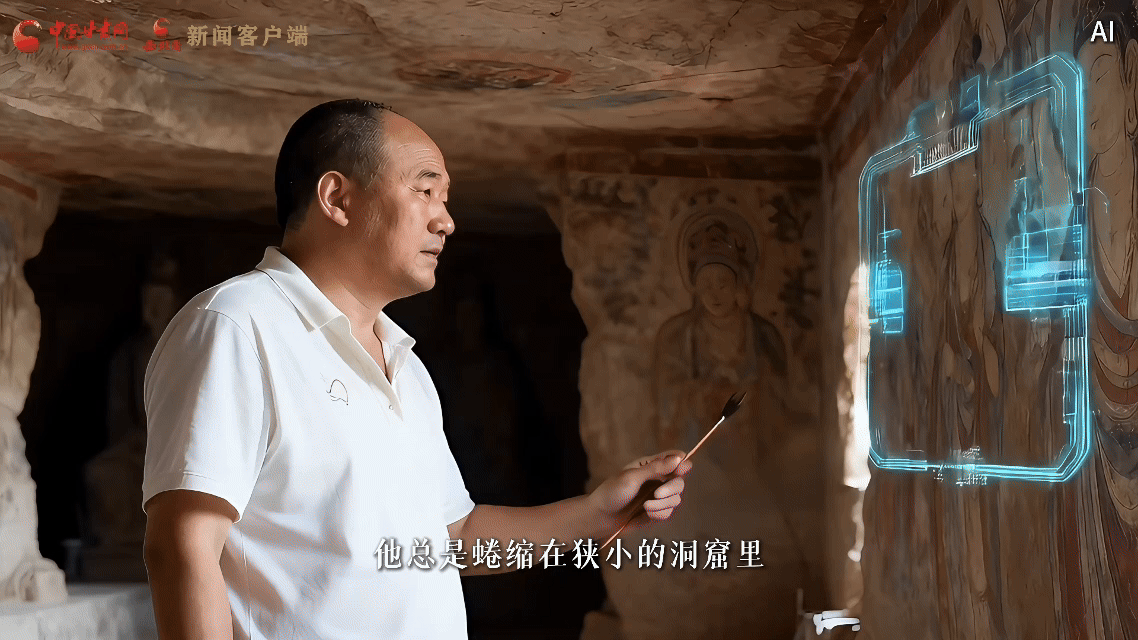 李波接過父親李云鶴的接力棒,操作AI系統(tǒng)開展修復(fù)工作,他遵循 “干一行、愛一行,鉆一行、精一行” 的理念,從學(xué)徒成長為“全國技術(shù)能手”,讓“莫高精神”在戈壁灘延續(xù)。