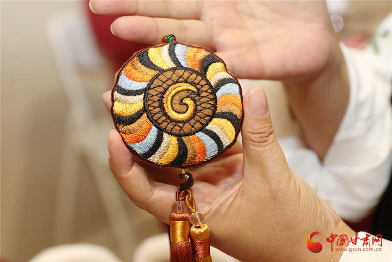 真正讓她想“給香包加點新東西”,是一次省博看展的觸動。站在馬家窯彩陶罐前,她盯著罐身流轉的旋渦紋出了神:“這么好看的紋路,繡在香包上多妙?”后來去敦煌,莫高窟里飛天的飄帶、藻井的繁復花紋更讓她挪不開腳?;貋淼穆飞希粋€念頭愈發(fā)清晰:要讓博物館里的文物“活”在香包里,讓老手藝沾染上“文化氣”。
