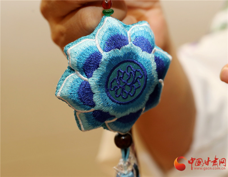甘肅省博物館非遺集市的展臺前,包雨蕾的敦煌藻井香包一亮相就攥住了人的目光——青綠色絲線繞出的蓮瓣層層疊疊,中心飛天剪影隨腳步輕晃,清雅檀香混著花草香漫開來。這款光是飛天飄帶針法就琢磨了一個月的新作,藏著她的心思:用慶陽香包的針腳,把甘肅的千年文脈繡進當下生活。