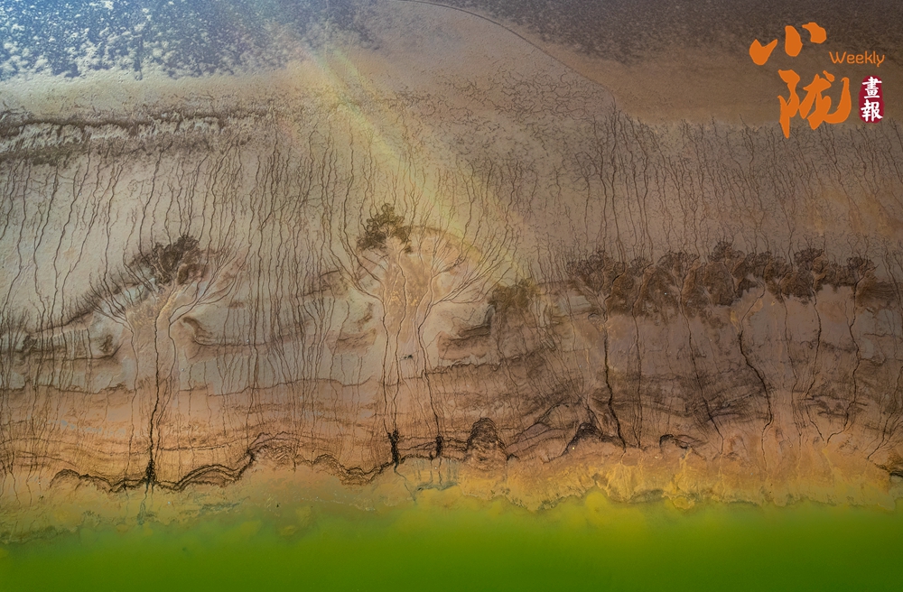 干燥的泥表交錯(cuò)分布、由主到次不斷分岔,形成如老樹(shù)虬根般蜿蜒伸展的圖案。那細(xì)膩而連貫的線條,猶如大自然親手繪制的一幅“根系地圖”,記錄著水分消退的足跡。