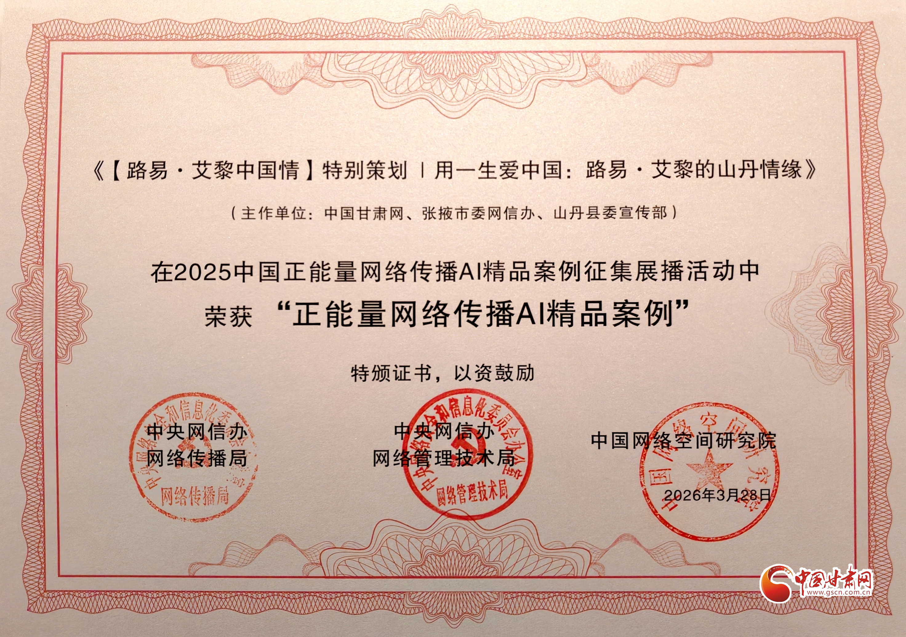 剛剛!中國(guó)甘肅網(wǎng)特別策劃《用一生愛中國(guó):路易·艾黎的山丹情緣》榮獲2025中國(guó)正能量網(wǎng)絡(luò)傳播AI精品案例