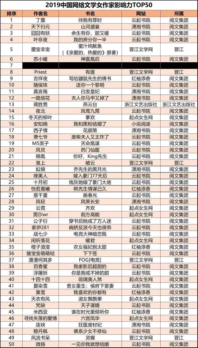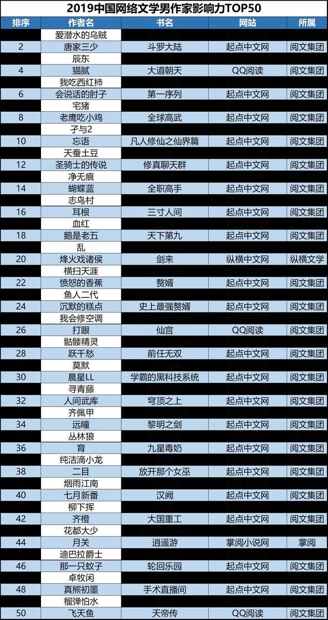 中國(guó)青年報(bào)客戶端訊(中青報(bào)·中青網(wǎng)記者 沈杰群)日前,《2019年中國(guó)網(wǎng)絡(luò)作家影響力榜》正式發(fā)布,通過(guò)對(duì)作家的作品影響力、平臺(tái)影響力及新媒體影響力多維度的分析與論證,綜合衡量出作家影響力,評(píng)選出國(guó)內(nèi)最具影響力男作家TOP50及女作家TOP50。