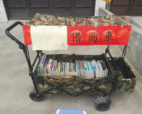 早上9點左右,自助借閱車從外婆家推出門,天黑了再推回來。看到想讀的書,讀者自行登記書名和個人信息,留下聯(lián)系方式,就能把書借回家。