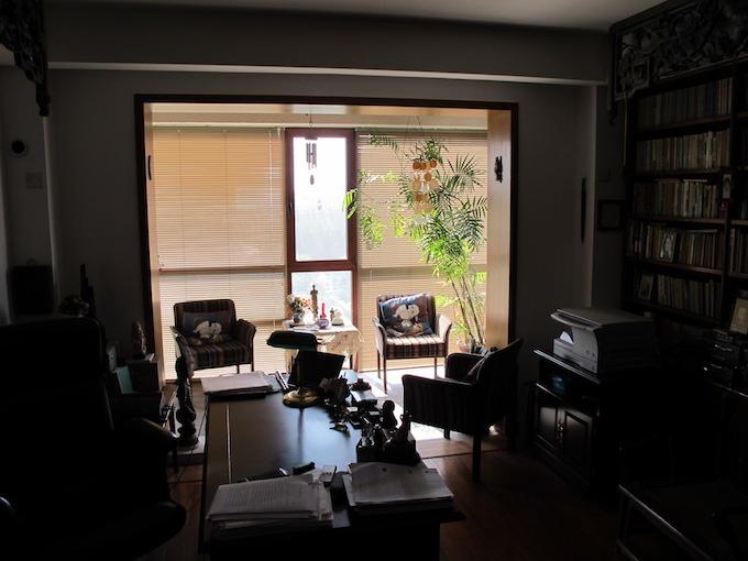 書桌上擺著臺燈、筆筒,以及他喜歡的各類藝術(shù)品。氣晴好時,逆向照進(jìn)來的陽光會把這一切都變成“剪影”,很美。