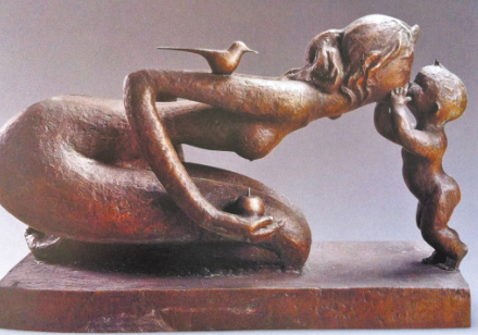 最后的廳,是一批中外馳名的雕塑代表作——從嬌小稚拙掌中把玩的小品到體量龐大高聳入云的巨構(gòu),無論隨形寫意、裝飾寫實,美林都在策劃、構(gòu)成、調(diào)整、定型的繁復(fù)過程中,顯示出扎實的藝術(shù)功力與非凡的浪漫色彩。其中,龍、虎、馬、牛等動物系列,不僅延續(xù)了繪畫中獨有的造型風(fēng)格,而且更凝重渾厚,更富裝飾情趣。與眾不同人見人愛的母子系列中,不論是精心呵護(hù)襁褓嬰兒的母親,匍匐草地引領(lǐng)學(xué)步的母親,牽手寶寶步入校園的母親,造型、肢體的夸張之奇變形之巧,感官、神態(tài)的風(fēng)韻依依顧盼有情,讓人駐足良久再三流連……