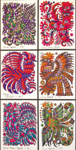 動物系列繪畫,從扎實而靈動的速寫與設(shè)計稿直至近似完美的正式作品,都蘊含了畫家捕捉物象的執(zhí)著與機敏,提煉造型的睿智與不懈,有了心血與摯愛的投入,那成竹在胸別具一格的小貓小狗小豬小鵝小猴也就躍然紙上呼之欲出了。在長方形的深色卡紙上,那銀色勾勒的活靈活現(xiàn)的百魚圖,讓我們沉醉于湛藍(lán)的海洋世界;在四方形的白色鏡框中,那七彩斑斕的百雞圖,讓我們迷戀于鄉(xiāng)間的濃郁風(fēng)情;還有鞠躬盡瘁一生奉獻(xiàn)膂力雄強的牛群系列,馳騁千里挾帶雄風(fēng)英姿勃勃的駿馬圖騰……
