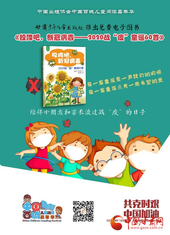 庚子之春,新冠肺炎疫情爆發(fā),全國(guó)人民奮力投身到這場(chǎng)疫情防控阻擊戰(zhàn)中,孩子們、兒童文學(xué)作家也紛紛創(chuàng)作了大量?jī)?yōu)秀的童謠。2月份,讀者出版集團(tuán)旗下甘肅少年兒童出版社(以下簡(jiǎn)稱(chēng):甘肅少兒社),策劃上線了免費(fèi)公益數(shù)字出版物《投降吧,新冠病毒——2020戰(zhàn)“疫”童謠60首》。書(shū)中收錄60首優(yōu)秀童謠作品,對(duì)兒童進(jìn)行防疫科普宣傳,以期提高兒童科學(xué)防護(hù)意識(shí)和戰(zhàn)勝病毒的信心。一首首童謠匯集起來(lái),架起了孩子和家長(zhǎng)共同抗疫的橋梁,也點(diǎn)亮了孩子們用稚嫩的眼光和思維認(rèn)識(shí)這場(chǎng)災(zāi)難的微光。