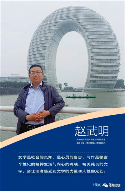 懷瑾握瑜,勤耕不輟。趙武明的寫作是安靜的,由于從事20余年的新聞工作,給他貯存了很多素材,所以他涉獵的寫作范疇很廣,寫散文隨筆、文藝評論、紀錄片、微電影、大型晚會總撰稿,還研究網(wǎng)絡(luò)文學。如果說文字是會呼吸的,趙武明的文字除了唯美,更多的是硬骨錚錚,也不乏柔腸的峻厲和倬約,風姿獨具,淡雅濃烈,相得益彰,簡約獨立,一語千里,蘊含張力。他常說,寫作要穿透人心抵達靈魂。向外,不斷追求生命更高的境界;向內(nèi),不斷觸及心靈。