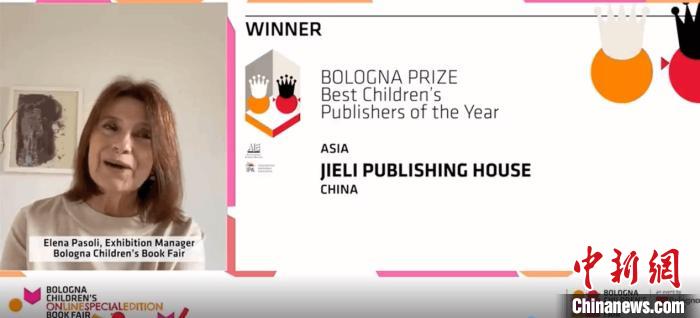 博洛尼亞童書展展覽總監(jiān)艾蓮娜?帕索里宣布2020年度最佳童書出版社大獎。接力出版社供圖