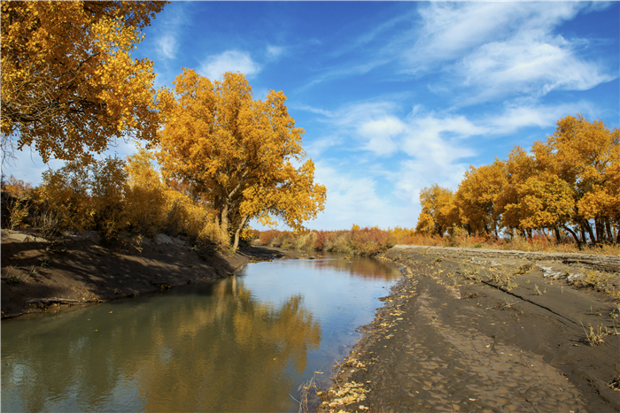 望桿傲立胡楊樹(shù),逾萬(wàn)年難腐。看錦繡金黃,彩袂飄飄,持練當(dāng)空舞。