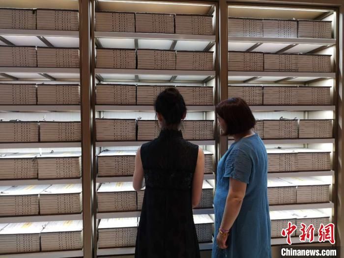 中新網(wǎng)杭州6月18日電(童笑雨) 古色古香的木質外包,干凈整潔的手工印刷,6月18日,線裝全套文淵閣《四庫全書》在浙江杭州展出。據(jù)相關負責人介紹,該套叢書將對民眾免費開放,各界人士均可來“西湖會客廳”閱讀、研究。
