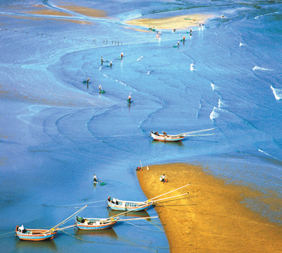 功夫不負有心人。經過漫山遍野地毯式的尋覓,鄭德雄一行把霞浦海灘的拍攝點摸了個遍,也拍出了一幅幅漂亮的好作品。那照片上的霞浦真是美啊:藍色的海水,金色的沙灘,種海帶的竹竿依序林立,滿載的漁船停泊在靜靜的港灣,趕海人背著沉甸甸的魚簍,正走在金色的沙灘上……