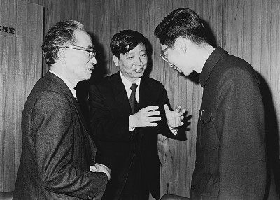 1976年秋天,增田涉(左)與魯迅之子周海嬰(右)在日本仙臺會面,中間系本文作者,在為兩人當翻譯