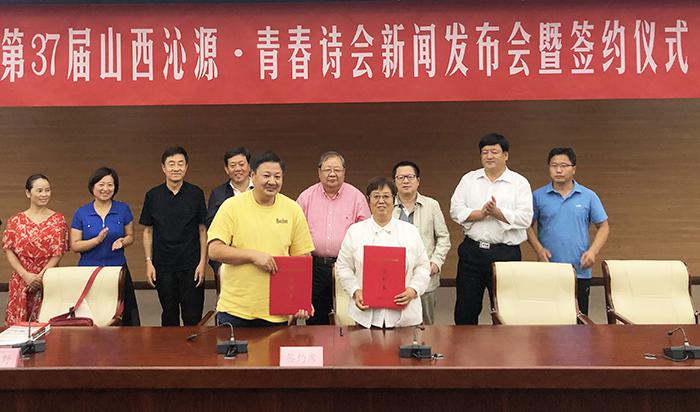 沁源縣委書記金所軍介紹沁源縣盛產(chǎn)油松、褐馬雞,村村有秧歌隊(duì)和籃球場,有山有水,美麗又美好。他將作為“全國森林旅游示范縣”的沁源縣詩意概括為“三晉大地的香格里拉”“近在咫尺的桃花源”。沁源縣委宣傳部部長黃貴河對沁源縣的文學(xué)創(chuàng)作情況及第37屆“青春詩會”活動承辦設(shè)想進(jìn)行了介紹。發(fā)布會結(jié)束后,沁源縣政府副縣長李建萍與《詩刊》事業(yè)發(fā)展部副主任藍(lán)野簽定了合作協(xié)議。