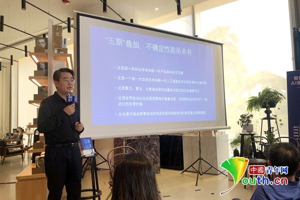 《智能經(jīng)濟(jì)》新書研討會上,張曉峰在進(jìn)行主題演講。中國青年網(wǎng)記者 張?jiān)姮?nbsp;攝