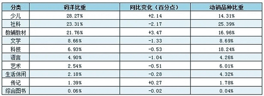 從細分市場情況來看,中小學(xué)幼兒園教材、法律、傳記、學(xué)術(shù)文化、教輔和少兒類呈現(xiàn)正向增長,其余類別均表現(xiàn)為同比負增長。