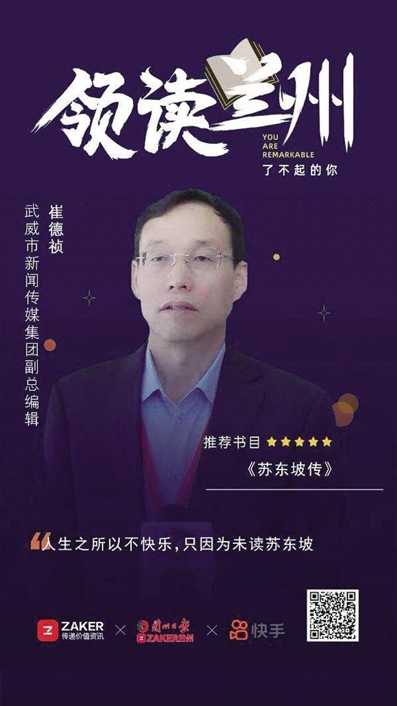 “領(lǐng)讀蘭州·了不起的你”大使薦讀進(jìn)行時(shí)……今天的薦讀大使是武威市新聞傳媒集團(tuán)副總編輯崔德禎,他最近正在讀的書是林語堂先生的《蘇東坡傳》,他向大家推薦這本書,希望跟大家一起閱讀!