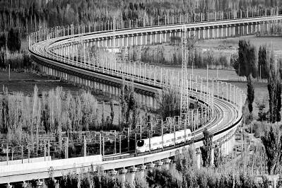 伴隨改革開放大潮,中國(guó)發(fā)展日新月異,高鐵、快遞、“天眼”望遠(yuǎn)鏡、粵港澳大橋等新事物都被詩人們?nèi)谌朐娦?。圖為行駛中的蘭新高鐵列車。新華社發(fā)(蔡增樂攝)