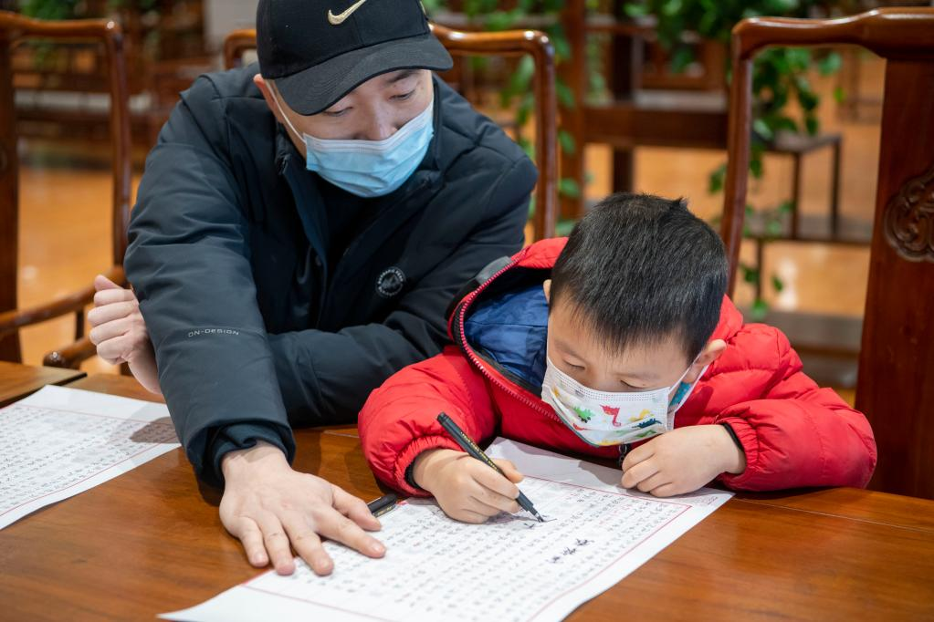 2月6日,小朋友和家長(zhǎng)在太原市圖書(shū)館參加“觀四庫(kù) 抄經(jīng)典”活動(dòng)。